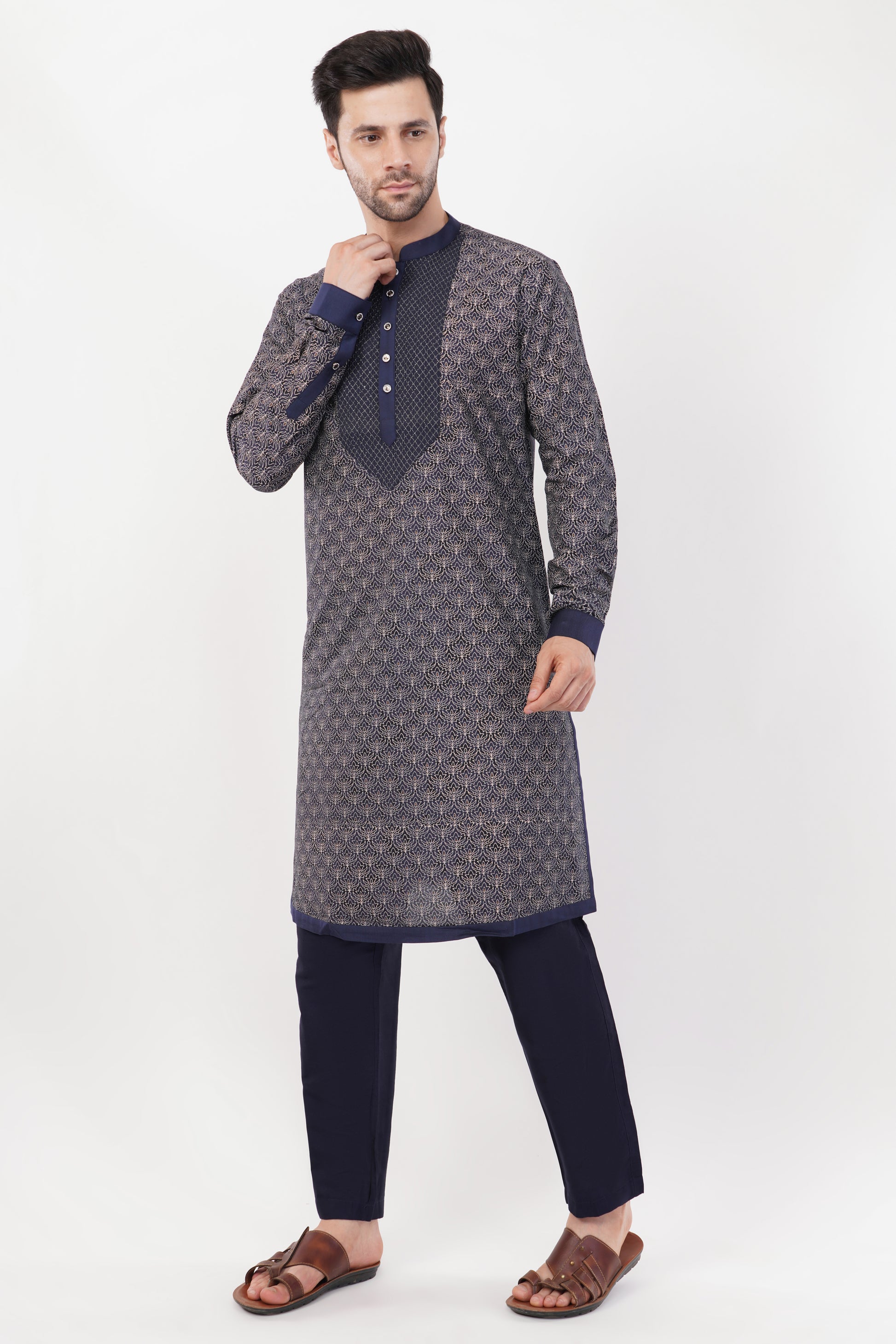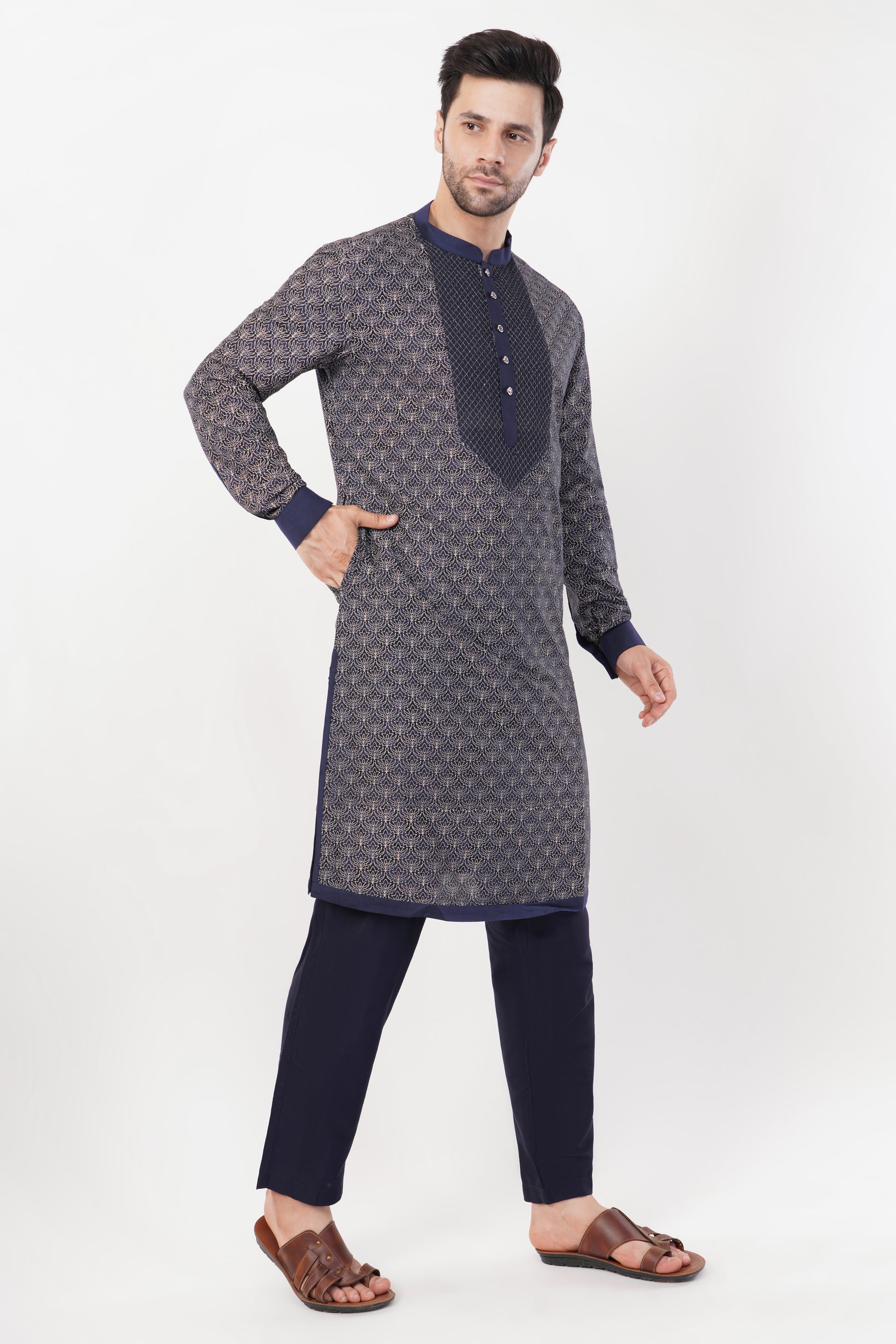 This Printed Cotton Kurta Set showcases a sophisticated pintuck design with zari diamond stitchline at the bib, adding a touch of elegance. The intricate print and contrasting placket enhance its appeal, making it perfect for festive occasions, cultural gatherings, and celebrations. Paired with matching trousers, it offers a stylish yet comfortable look.