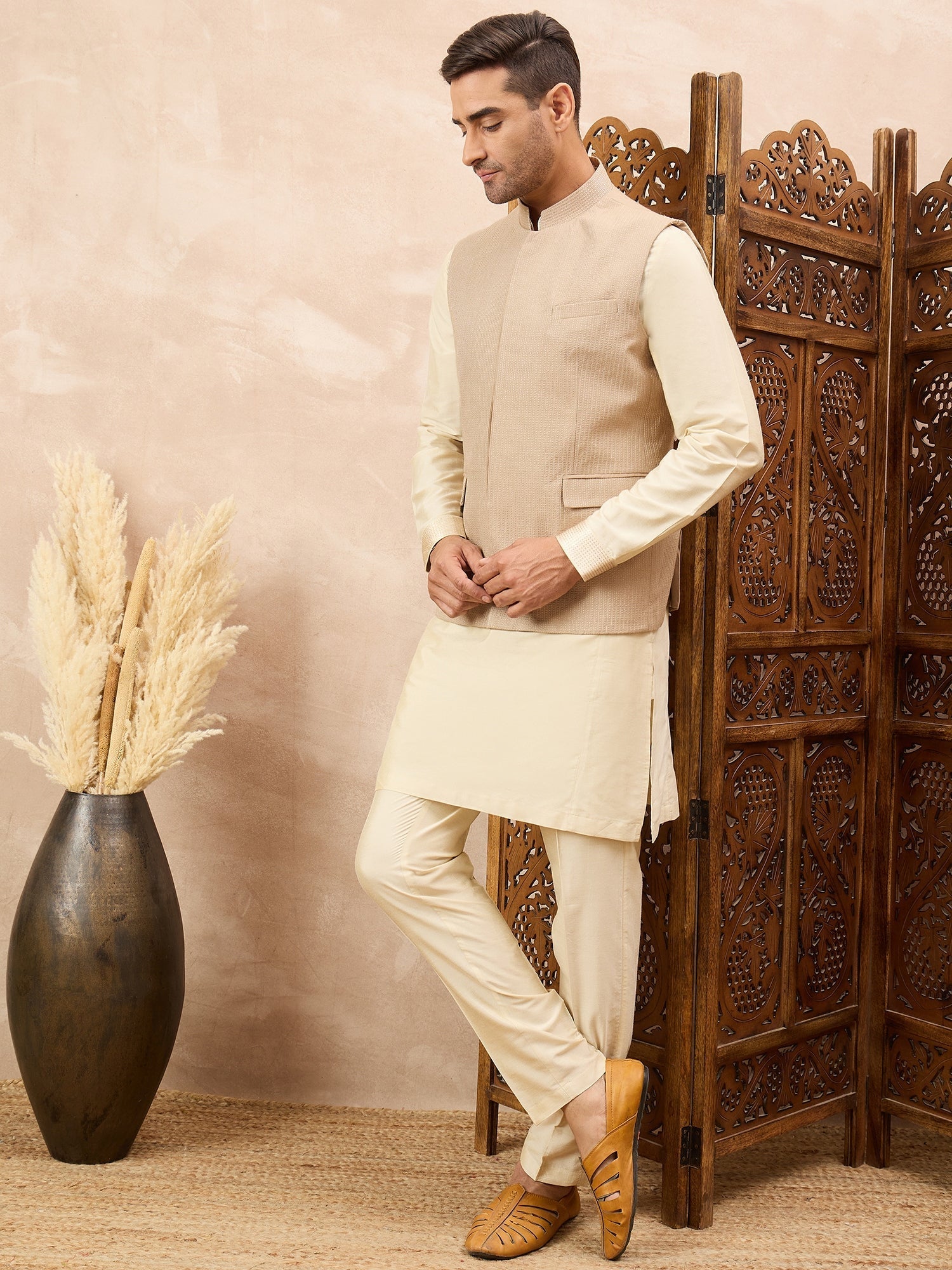 Understated elegance with a beige-toned textured waistcoat over a soft cream kurta setÑsmart, breathable, and easy to carry.