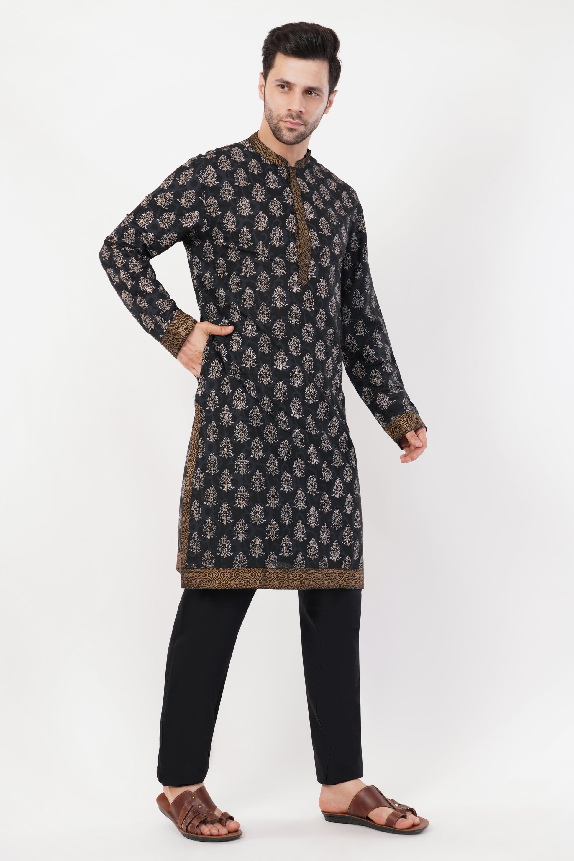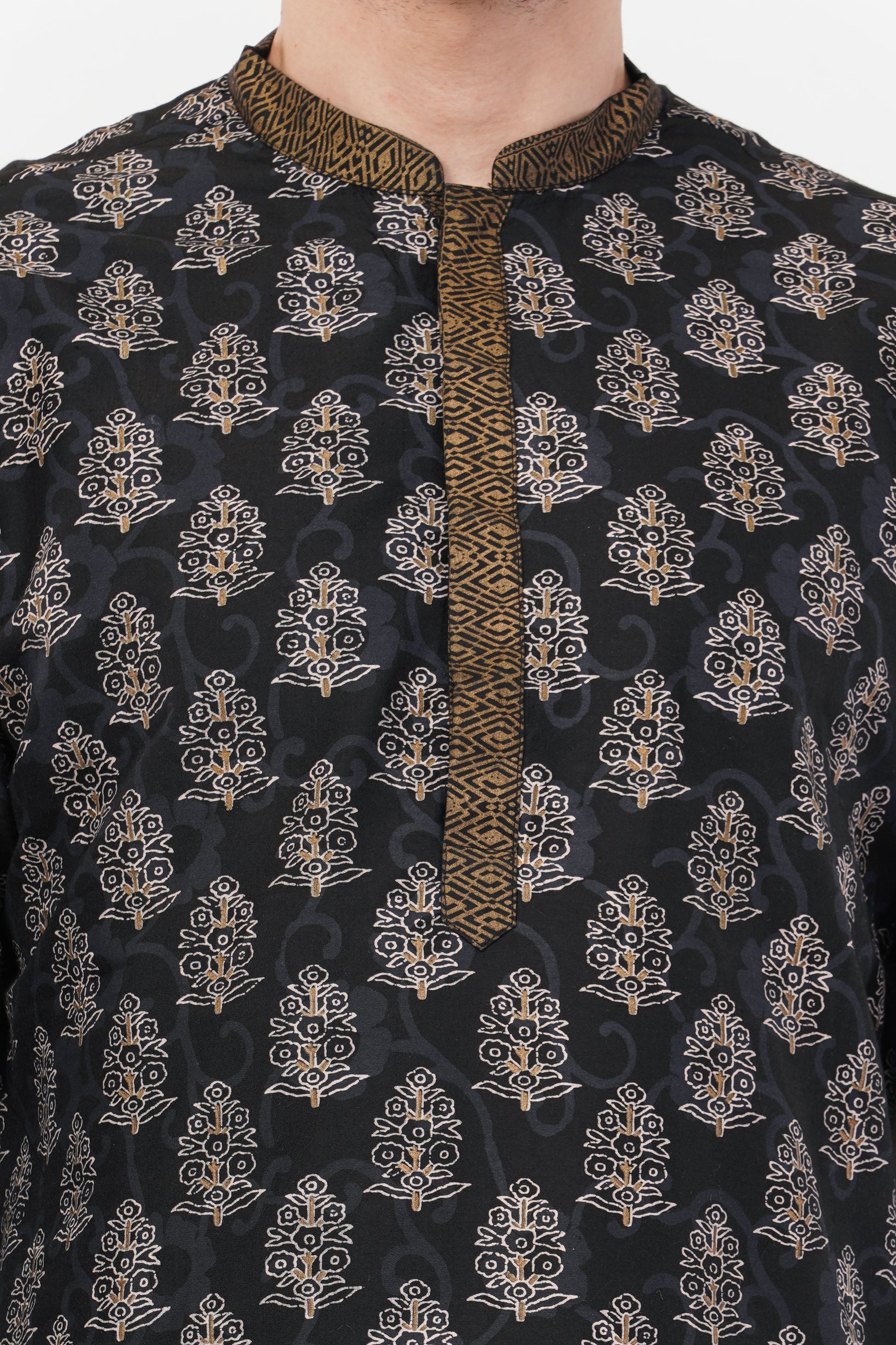This Black Printed Cotton Kurta Set features a regal all-over print with exquisite gold detailing on the placket, cuffs, and hemline, adding a luxurious touch. Crafted from breathable cotton fabric, it ensures both comfort and elegance. Paired with matching trousers, this ensemble is perfect for festive occasions, weddings, and cultural celebrations.