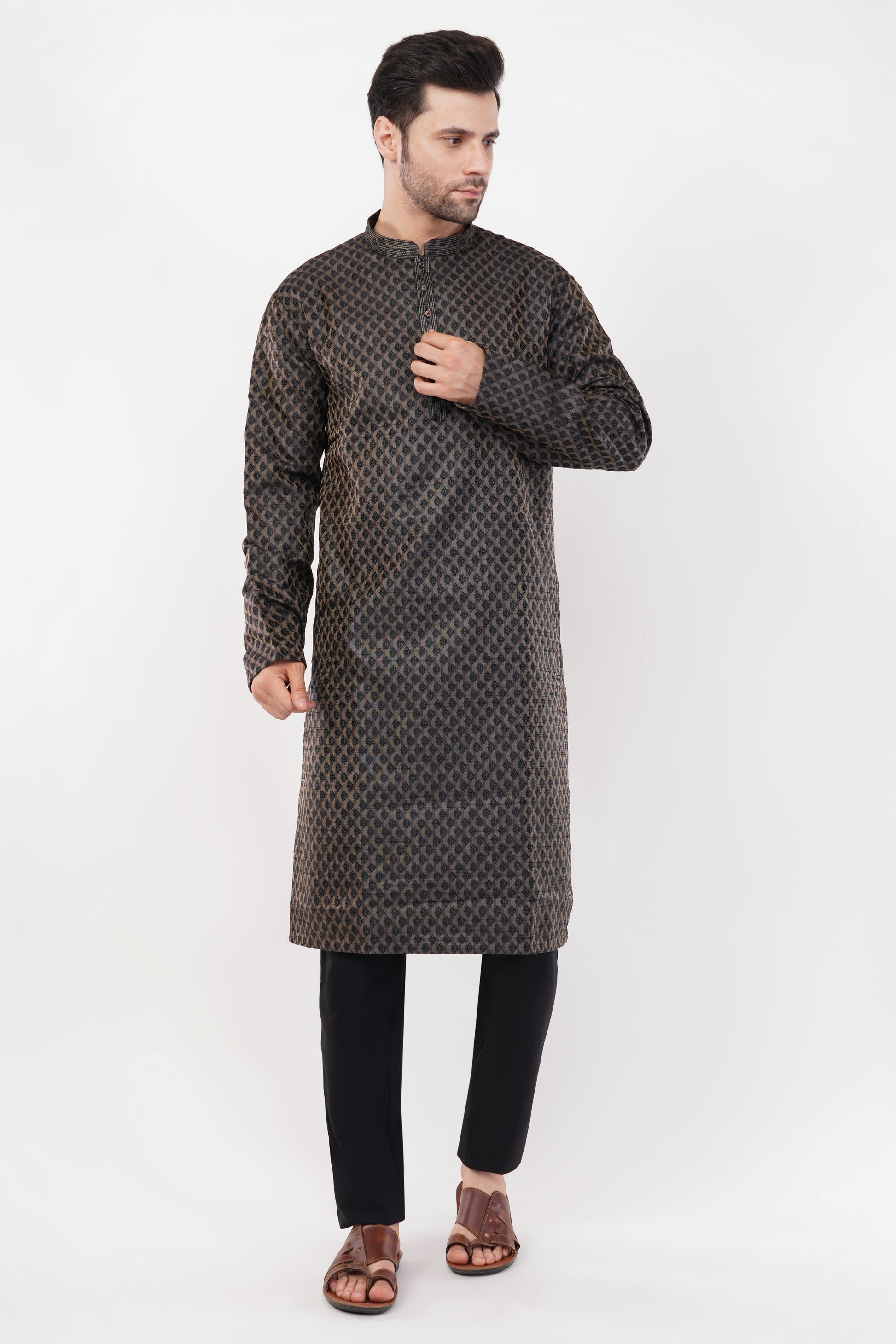 This Black Printed Cotton Kurta Set features a sophisticated all-over print with subtle embroidery on the placket, adding a refined touch. Crafted from breathable cotton fabric, it ensures both comfort and elegance. Paired with matching trousers, this ensemble is perfect for festive gatherings, cultural events, and special occasions.