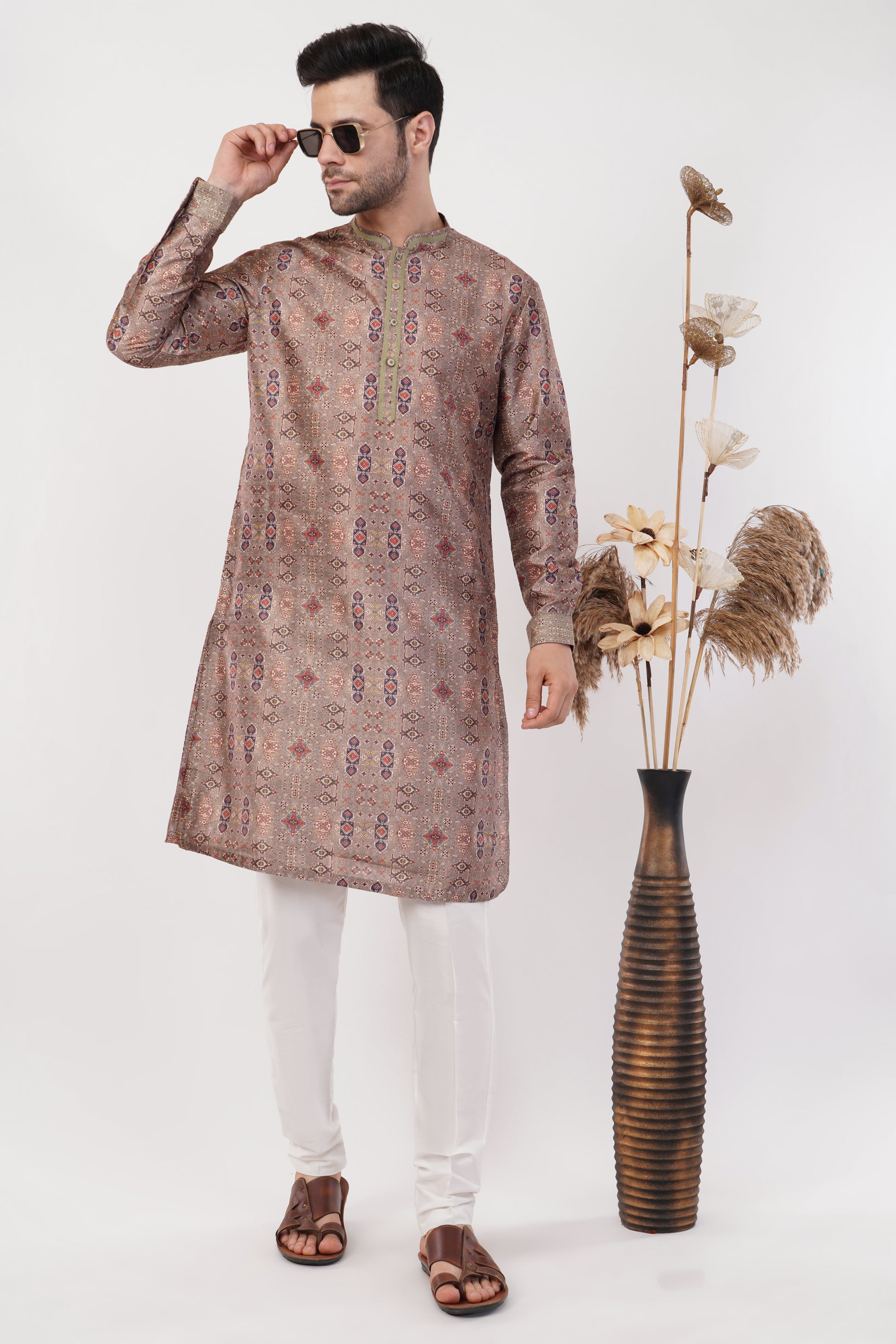 This Beige Printed Cotton Kurta Set is a perfect blend of tradition and modern style, featuring an intricate all-over print that adds depth to its design. Crafted from lightweight and breathable cotton, it offers all-day comfort. Paired with crisp white trousers, this outfit is ideal for festive occasions, cultural events, and family gatherings.
