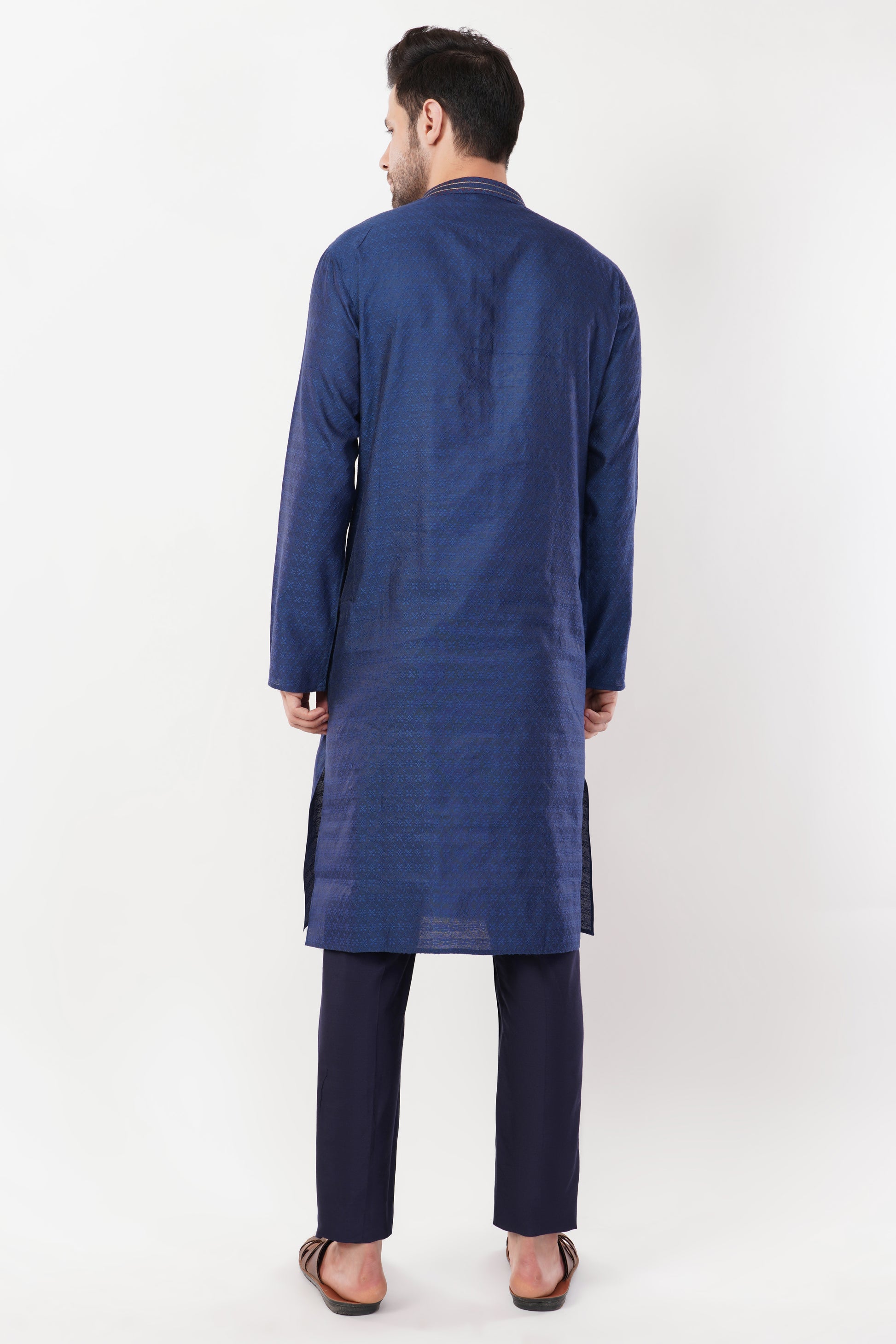 This Indigo Blue Cotton Kurta Set features a stylish textured design with intricate embroidery on the placket, adding an elegant touch. Crafted from breathable cotton fabric, it ensures comfort and a refined look. Paired with matching trousers, this ensemble is perfect for festive occasions, weddings, and cultural celebrations.