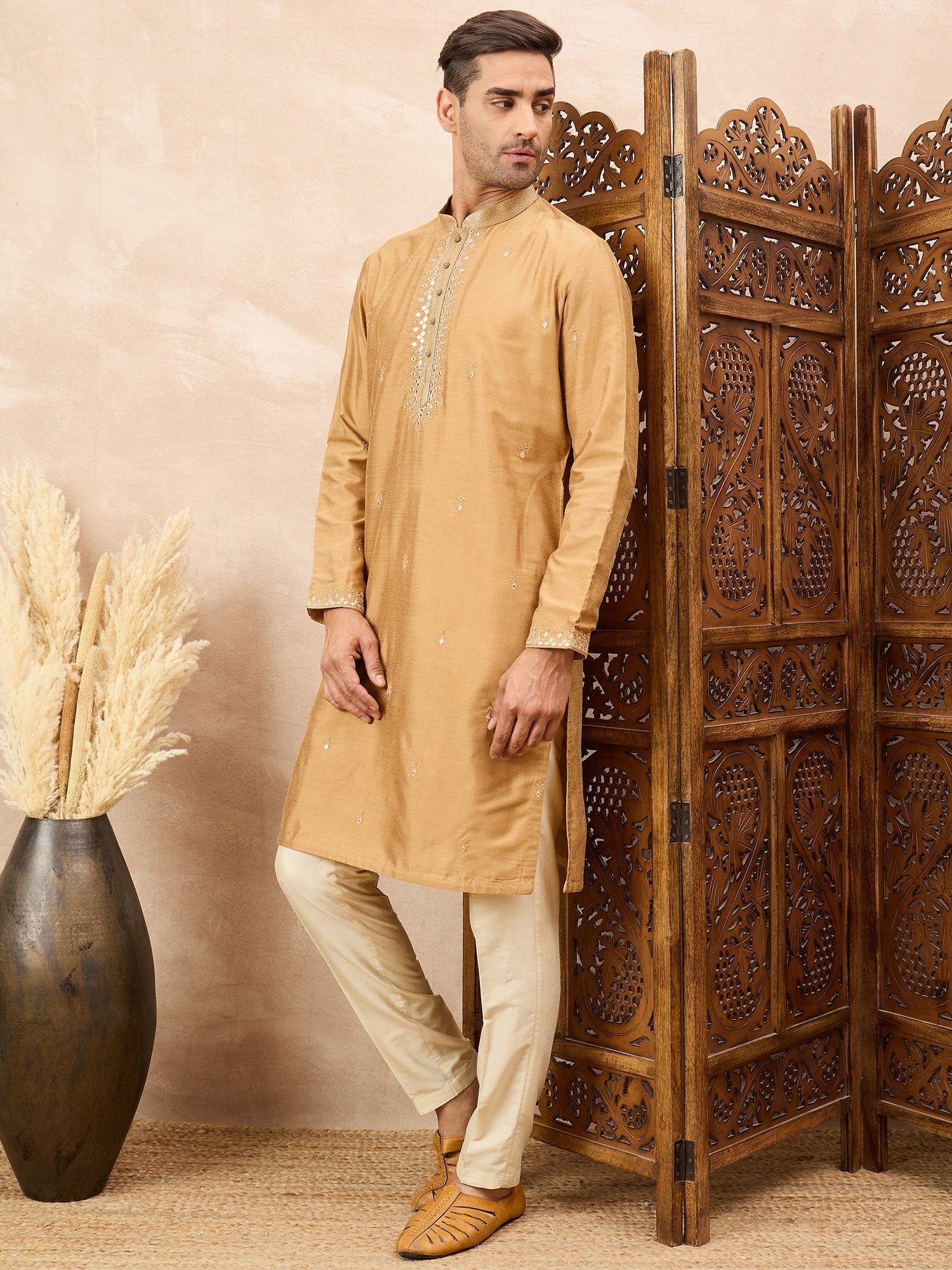 Hand-embroidered kurta in a soft golden shade, ideal for daytime ceremonies or family events.