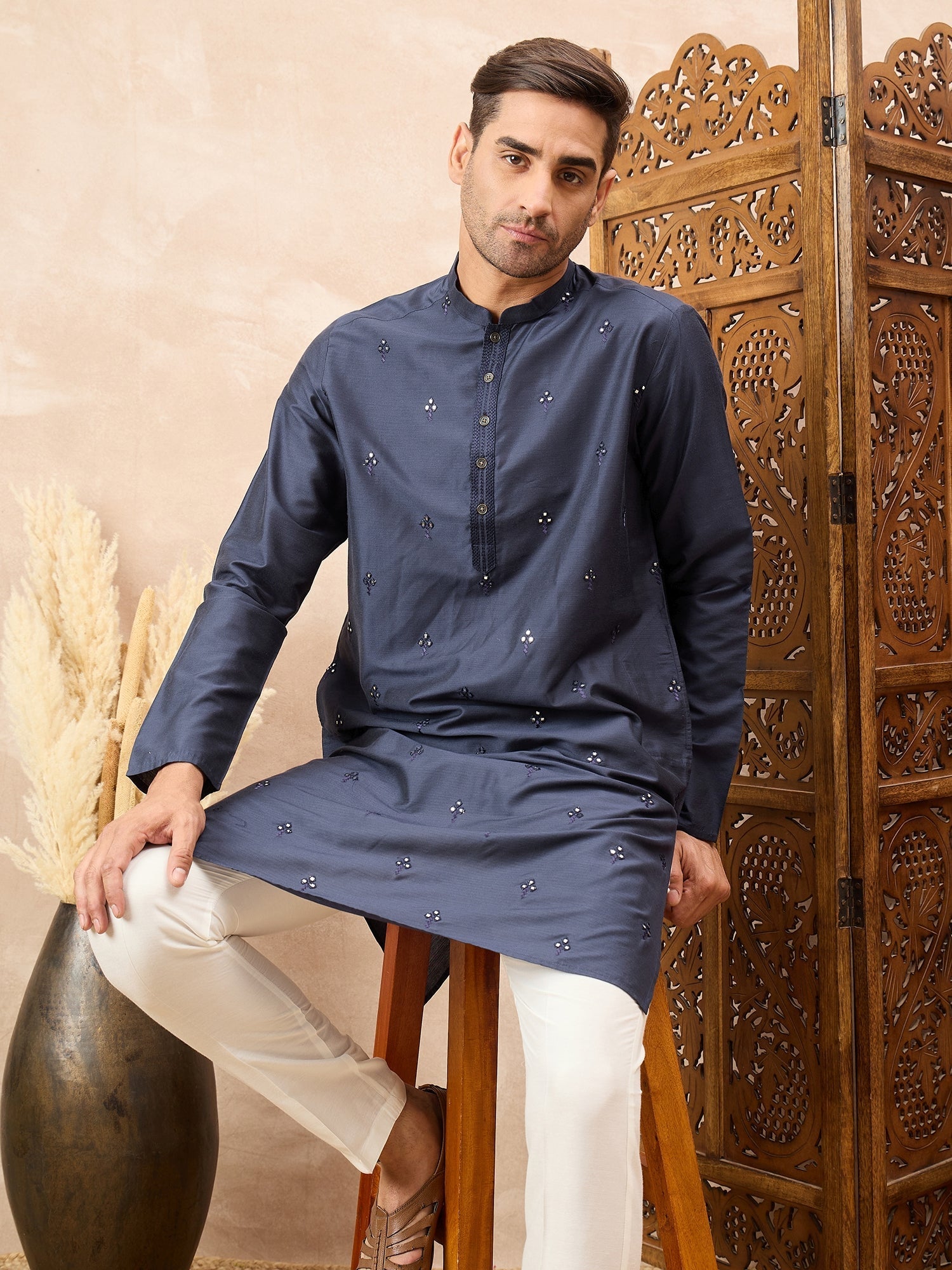 Dark navy blue kurta with spaced mirror workÑsmart pick for evening events and receptions.