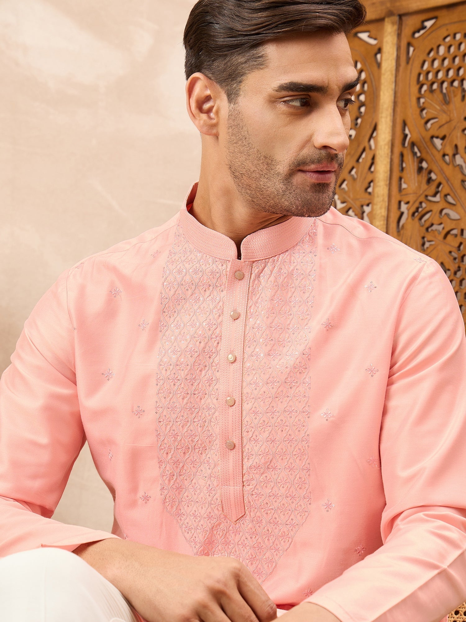 Soft peach-toned kurta with minimal thread workÑpaired with white pyjama for a fresh, summer look.