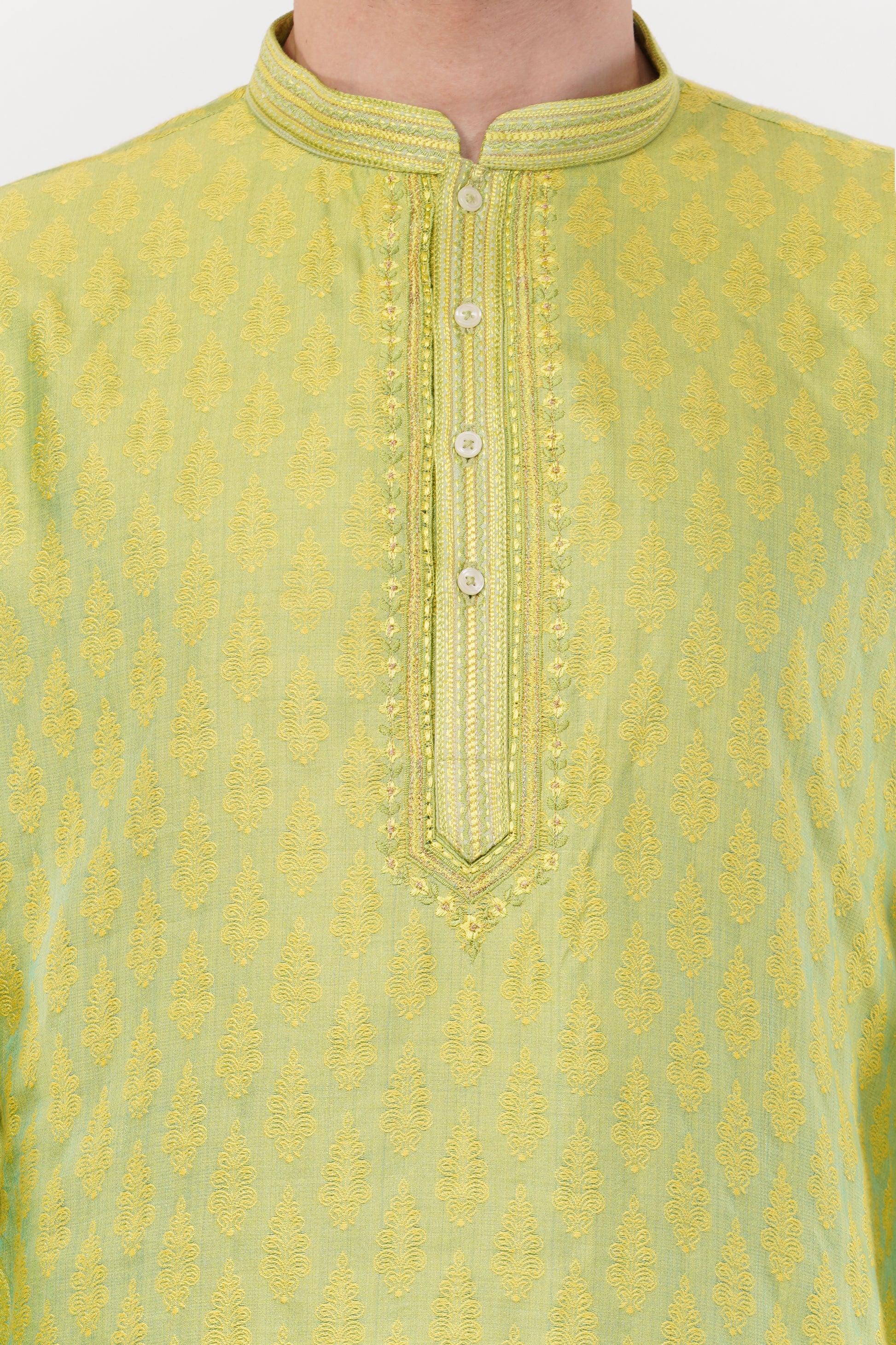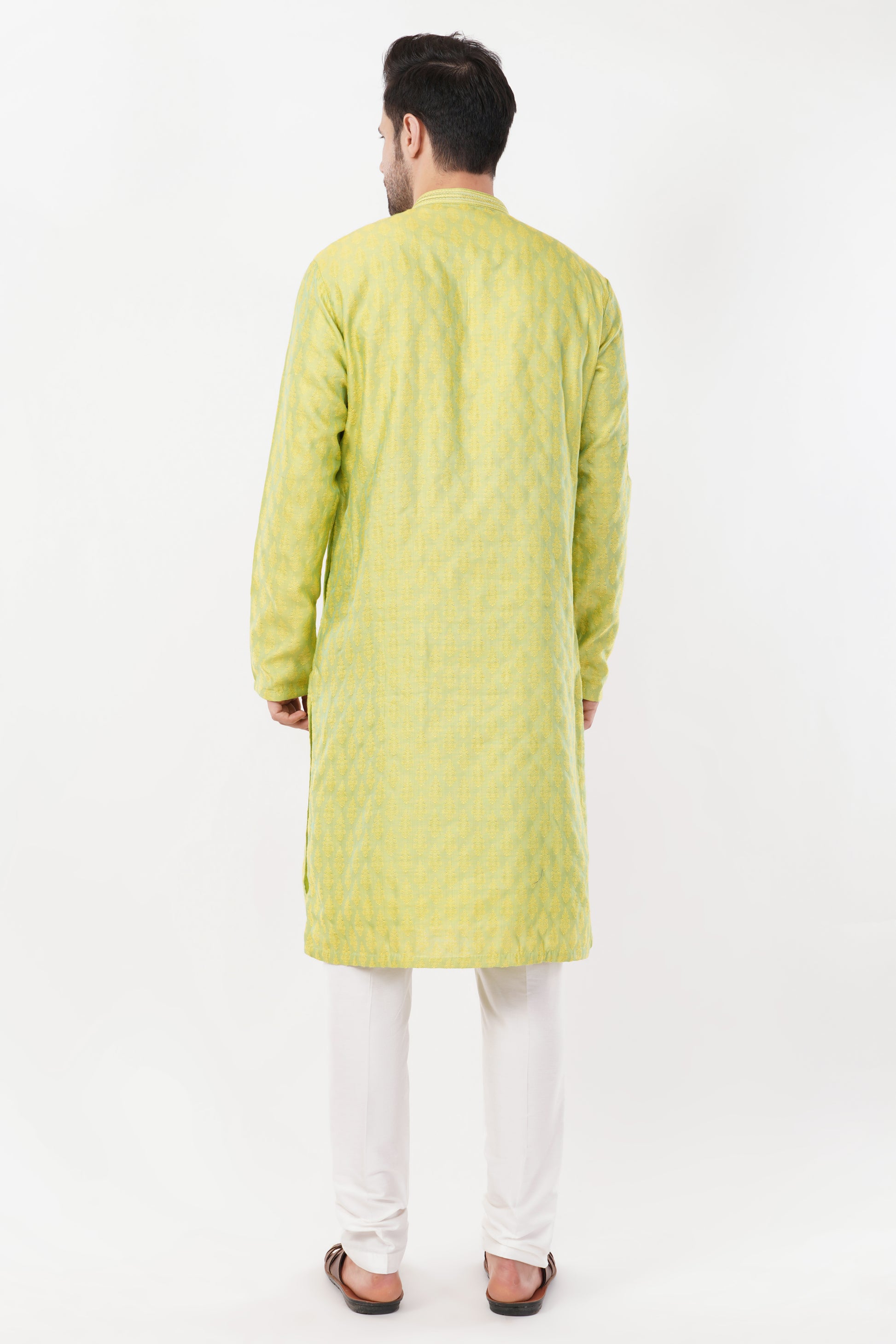 Brighten up your ethnic wardrobe with this Lime Green Cotton Kurta Set, featuring a delicate all-over print for a refined touch. The soft cotton fabric ensures breathability and comfort, making it an ideal choice for festive gatherings and celebrations. Paired with contrasting white trousers, this ensemble exudes elegance and charm.